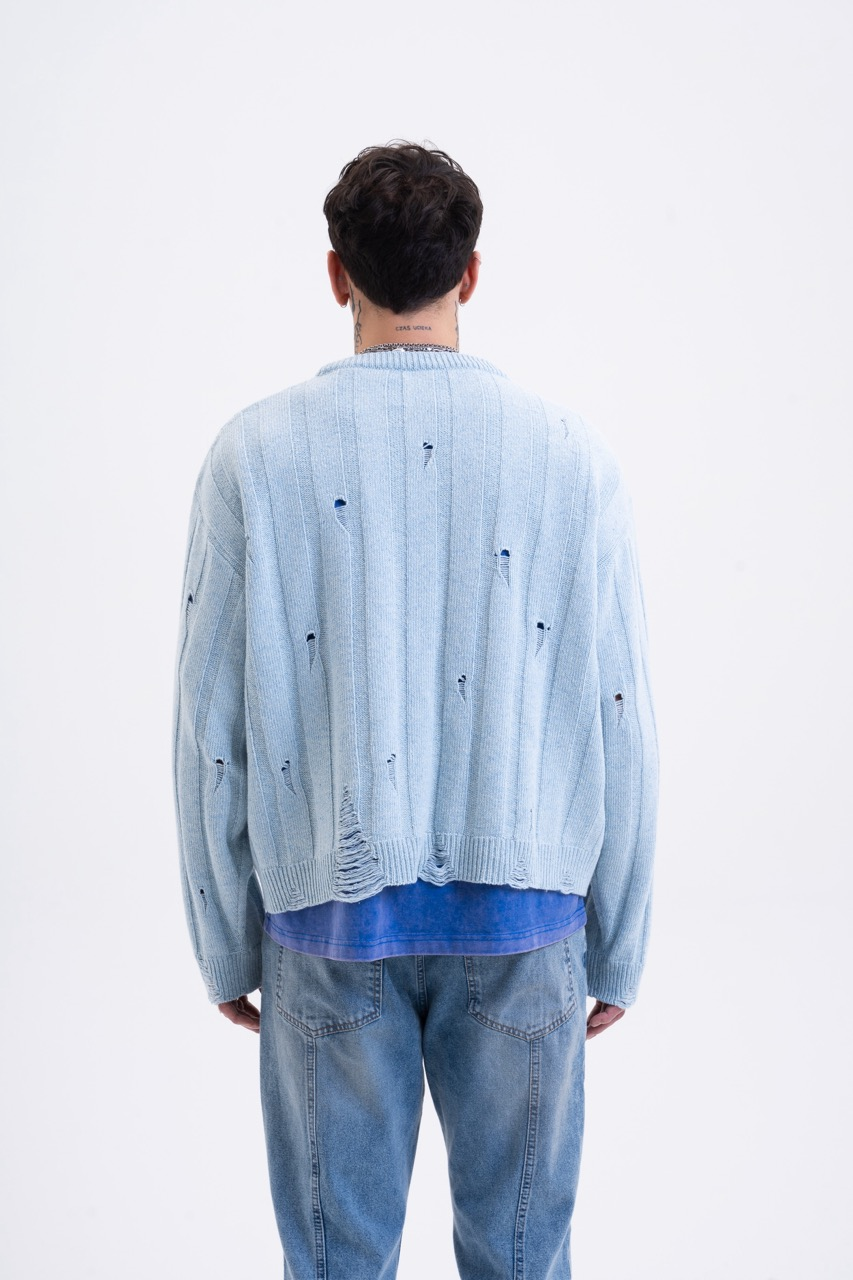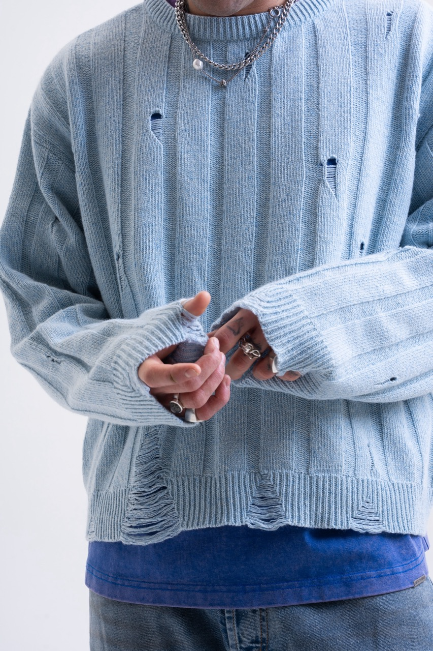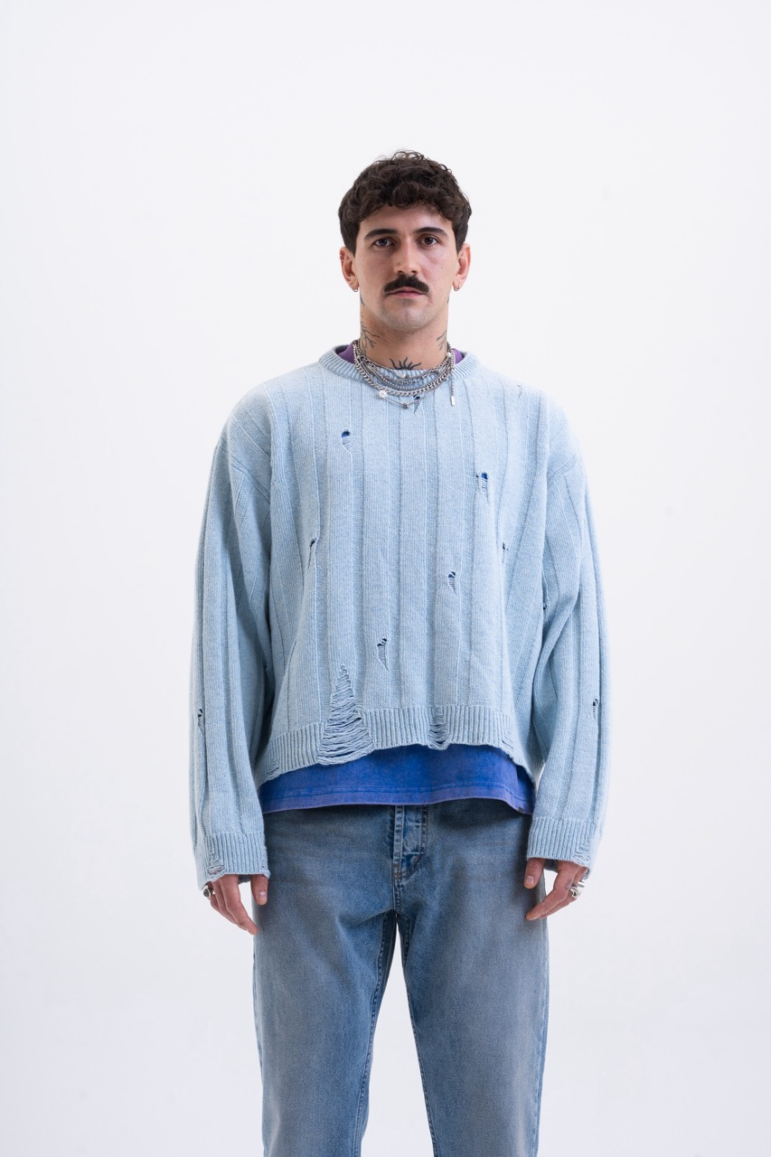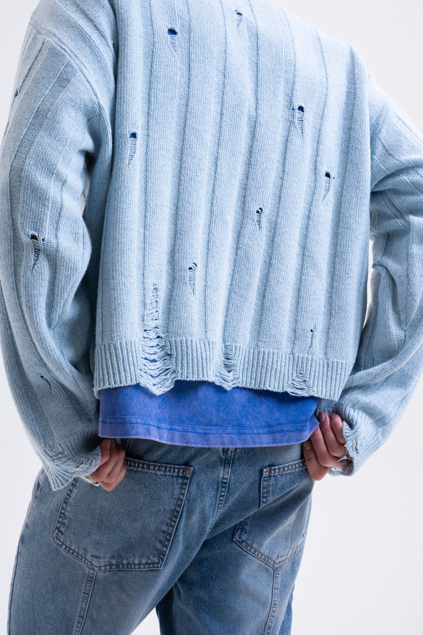 • Structure: Thick ribbed knit (Wide Rib) interrupted by intentional damages.