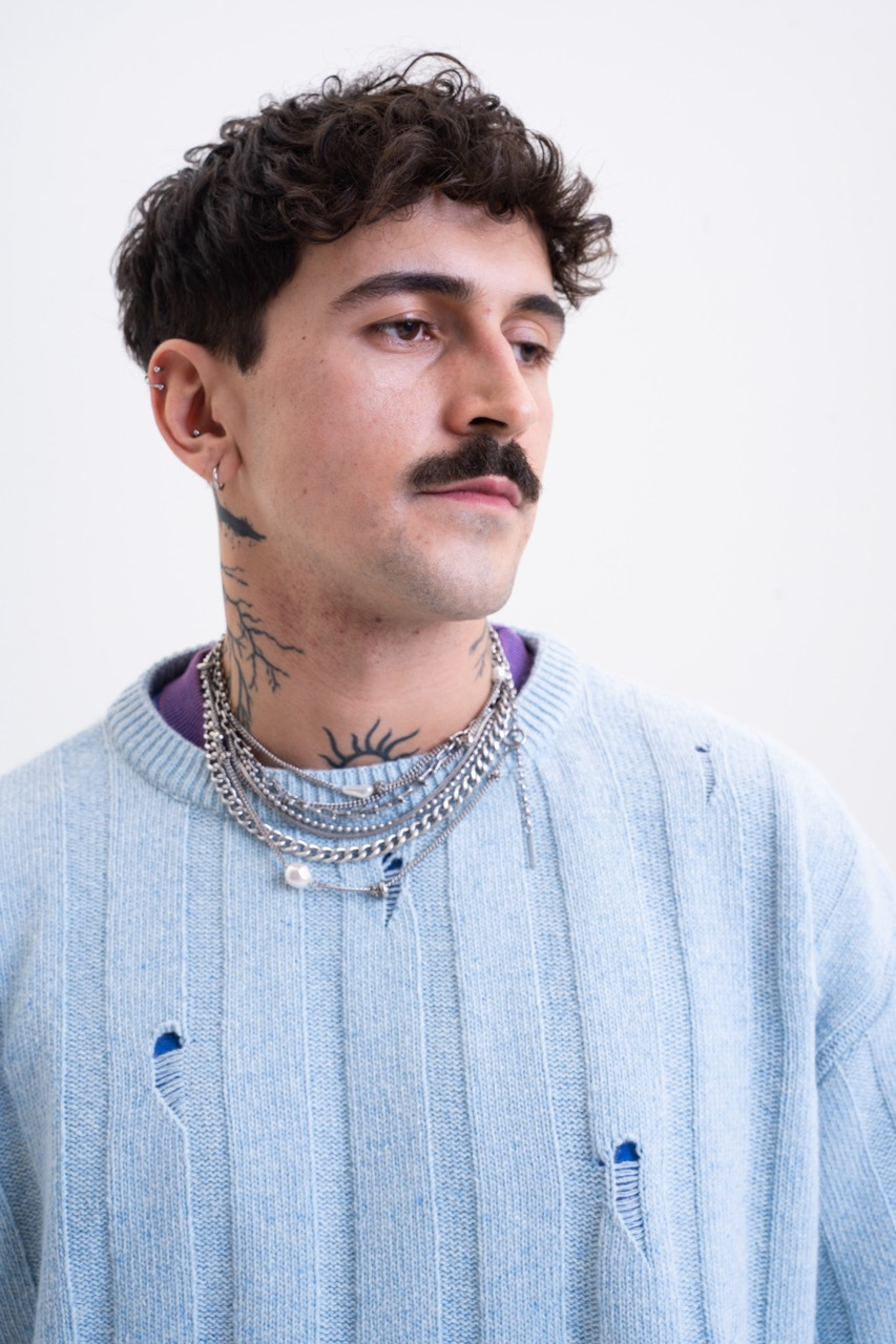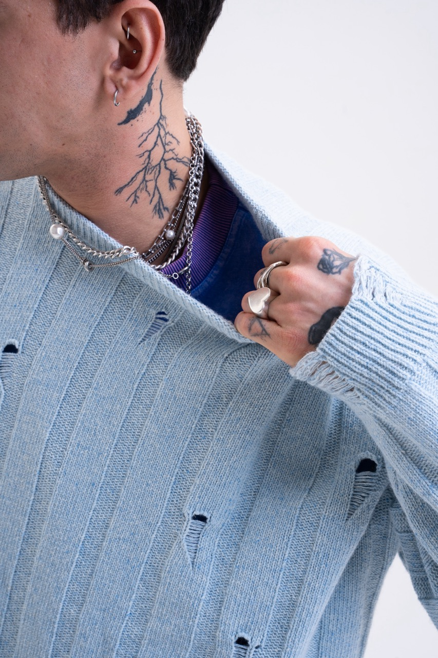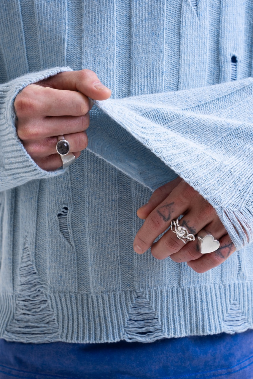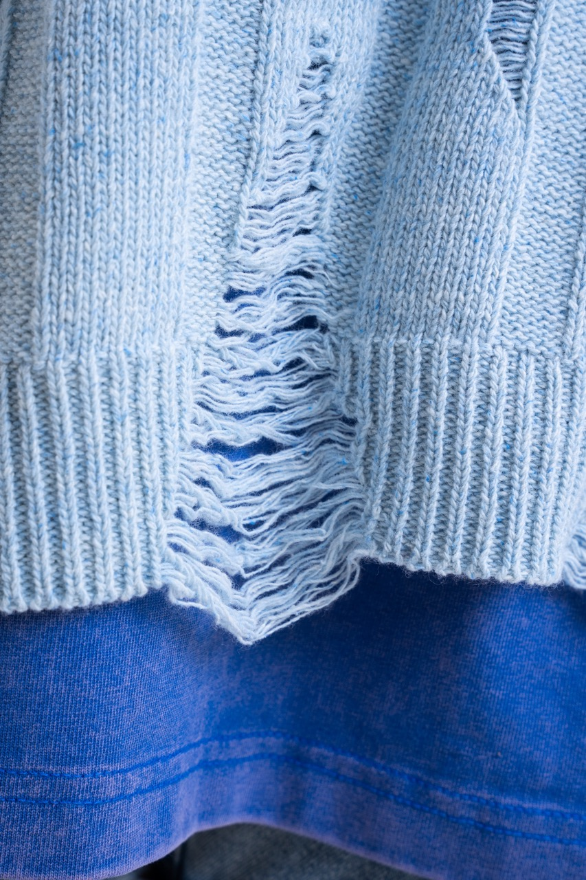 • Structure: Thick ribbed knit (Wide Rib) interrupted by intentional damages.