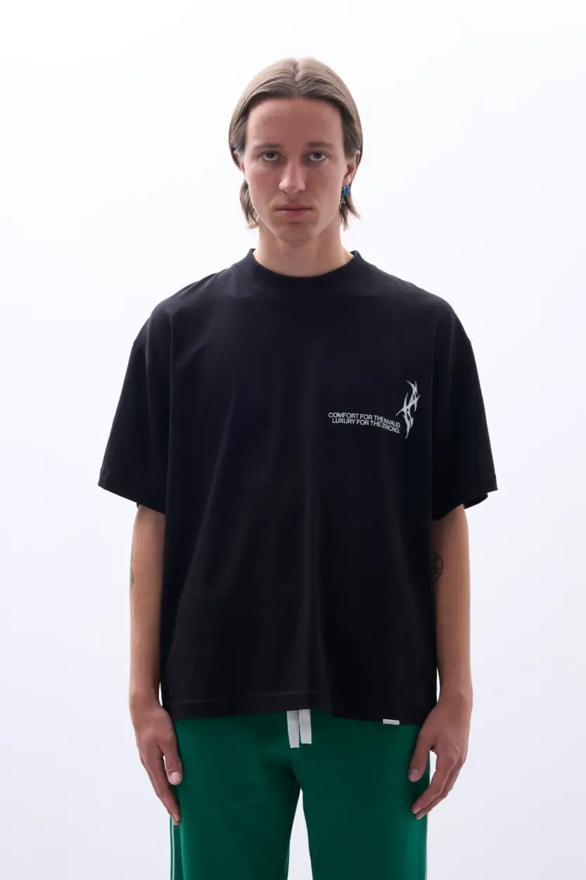 A tee that plays with the contrast of everyday life and street codes. On the front, a minimal print with a tribal accent and the phrase “comfort for the invalid, luxury for the strong.” The back features a bold graphic of a plastic chair with the words “sit down then relax”. The oversized fit and 180gsm cotton deliver comfort and durability, while the engraved GSFT® metal tag at the hem adds a signature detail.