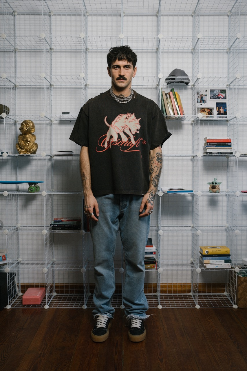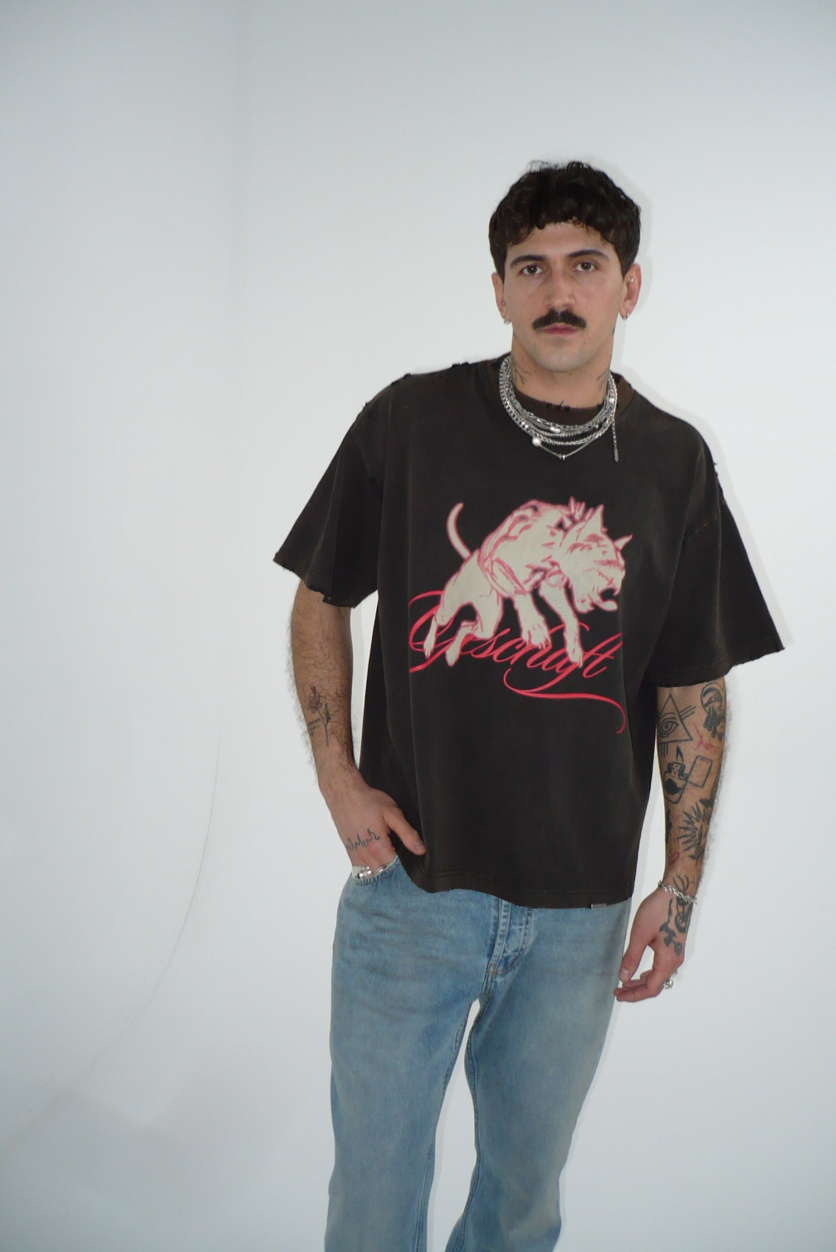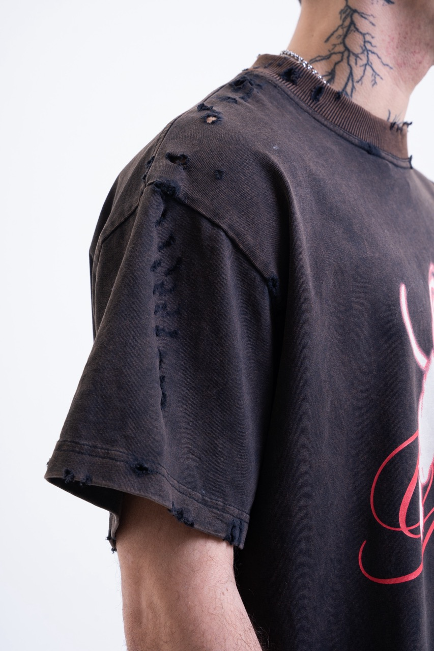 - Details: Hand-distressed edges on the collar, sleeves, and hem. Every hole is intentional.